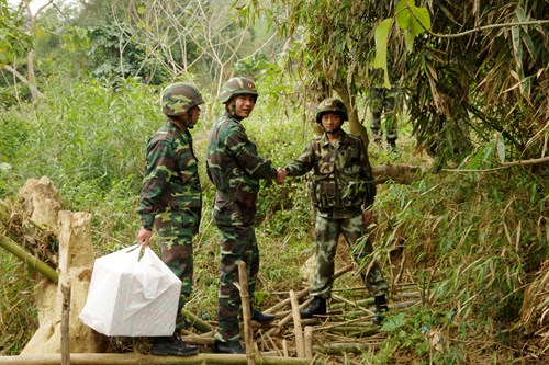 Đồn trưởng Đồn Biên phòng Bản Lầu Việt Nam và Chính trị viên Đồn Công an Biên phòng Long Bảo Trung Quốc gặp gỡ trên đường biên giới. |