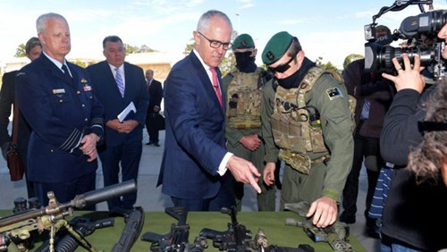 Ông Malcolm Turnbull tham quan sản phẩm quân sự tại một hội thảo ở Sydney Ảnh: thenewdaily.com.au |