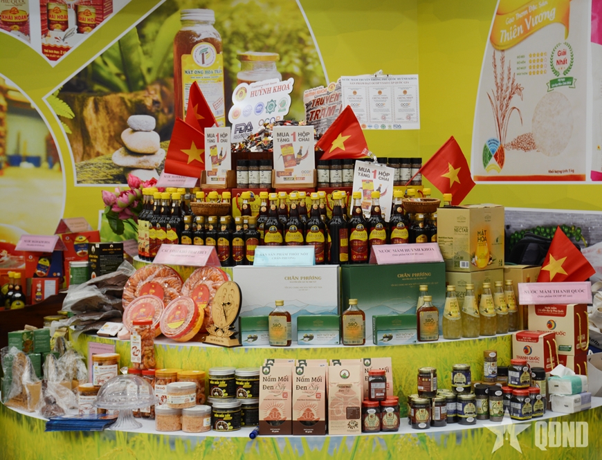 | Không gian trưng bày giới thiệu, quảng bá các sản phẩm đặc trưng của tỉnh như: Khô cá lóc, tôm khô; các sản phẩm thủ công mỹ nghệ từ chiếu Uzu, cỏ bàng; hàng OCOP, như: Nước mắm, sản phẩm từ tiêu, gạo xuất khẩu sang Nhật, nấm linh chi, mật ong, đường thốt nốt… |