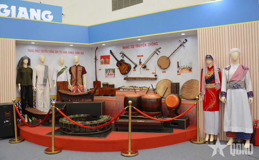An Giang là vùng đất giao thoa văn hóa độc đáo của 4 dân tộc Kinh, Khmer, Hoa, Chăm. Nơi đây lưu giữ 150 di tích lịch sử, văn hóa và các lễ hội; trong đó Lễ hội Vía Bà chúa xứ Núi Sam và nghệ thuật Đờn ca tài tử được UNESCO công nhận là Di sản văn hóa phi vật thể đại diện nhân loại. Trong ảnh: Không gian trưng bày văn hóa của 4 dân tộc sinh sống trên địa bàn tỉnh An Giang và bộ nhạc cụ truyền thống của đồng bào dân tộc Khmer và Chăm.