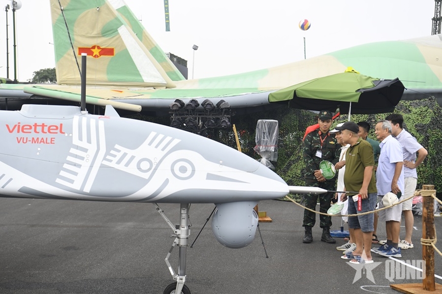 | Người dân tham quan, tìm hiểu về máy bay không người lái đa năng tầm xa (VU-MALE) do Tập đoàn Công nghiệp - Viễn thông Quân đội (Viettel) tự nghiên cứu chế tạo, đặt tại khu trưng bày ngoài trời của Bộ Quốc phòng. Ảnh: TUẤN HUY |