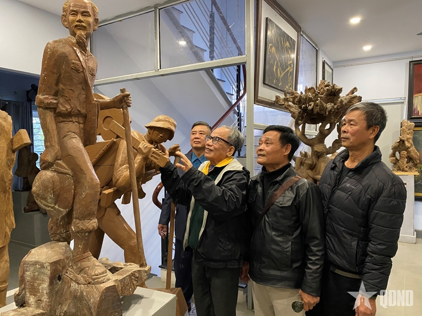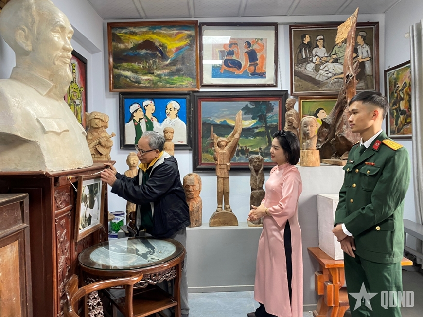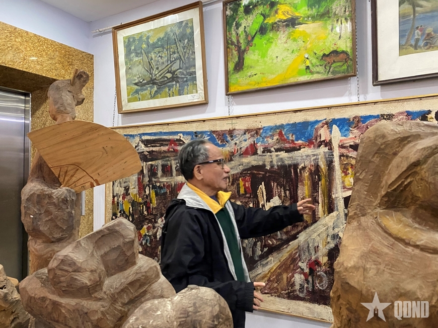 Đại tá, Anh hùng LLVT nhân dân, họa sĩ Lê Duy Ứng giới thiệu các tác phẩm được trưng bày tại nhà. Ảnh: DƯƠNG THU