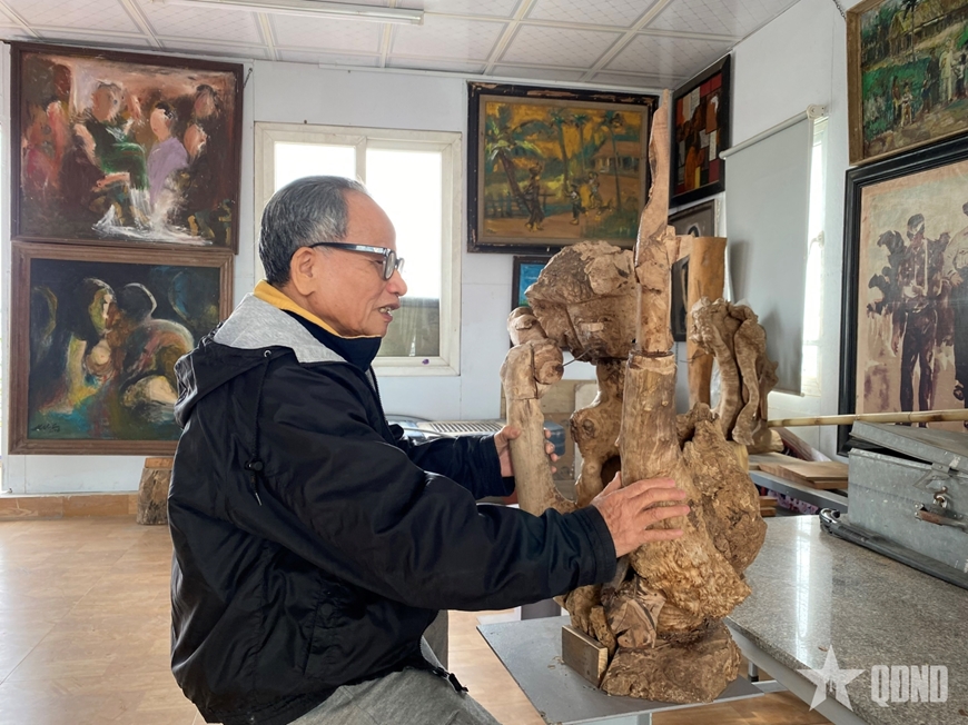 Ông dẫn tôi lên tầng trên cùng, khu vực sáng tác của ông, giới thiệu những tác phẩm ông đang thực hiện. Ông bảo, ông vẫn làm việc hằng ngày. Trong năm này, ông đặt chỉ tiêu hoàn thành 8 tác phẩm điêu khắc. Nhìn cách ông mở cổng đón khách, rồi đi từng tầng, đến từng tác phẩm, bước qua những bậc cầu thang lên xưởng sáng tác, thật khó để hình dung những bước chân, hành động ấy của một cụ ông mà đôi mắt đã nhiều năm không còn nhìn được. Hẳn là ông đã đi lại, làm việc, chăm sóc những tác phẩm nhiều lắm, mới thuộc từng bước chân, vị trí như vậy.