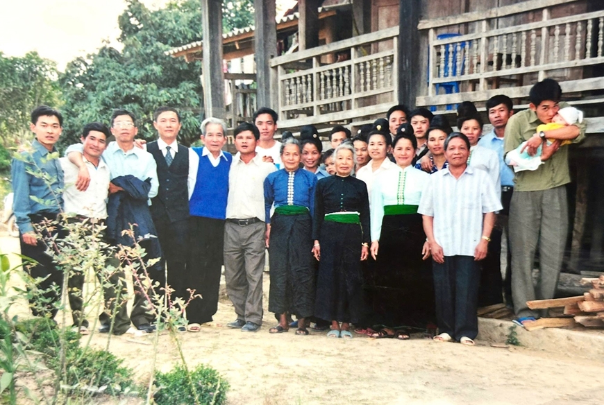 | Anh hùng Nguyễn Đình Thử (thứ 5 từ trái qua phải) chụp ảnh cùng gia đình tại bản Sốp Cộp, xã Sốp Cộp, tỉnh Sơn La. |
