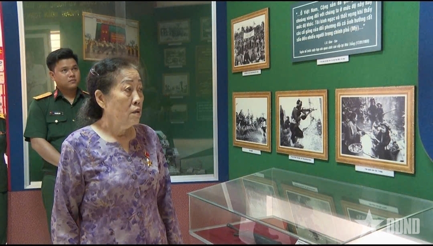 | Nữ anh hùng Lưu Nguyệt Hồng xem lại những tư liệu tại phòng truyền thống Bộ CHQS tỉnh Sóc Trăng (trước đây). |