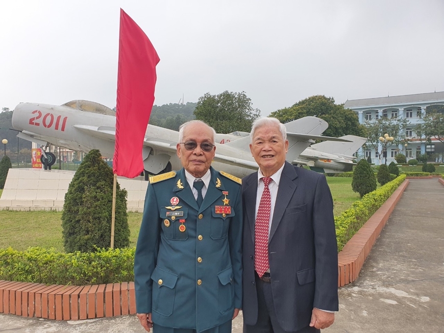 | Anh hùng LLVT nhân dân Lê Thanh Đạo (bên phải) và ông Lê Xuân Dỵ hội ngộ dịp kỷ niệm 55 năm Ngày truyền thống Sư đoàn 371, Quân chủng Phòng không - Không quân, tháng 3-2022. Ảnh: BÍCH TRANG |
