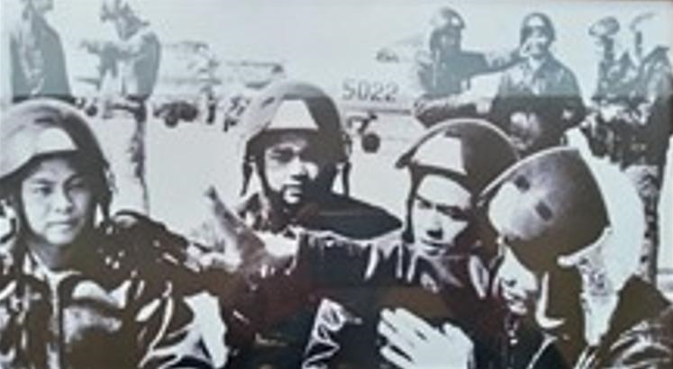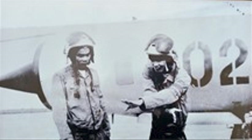 | Phi công Lê Thanh Đạo (bên trái) và Vũ Văn Hợp giảng bình sau trận đánh ngày 10-5-1972. Ảnh tư liệu |