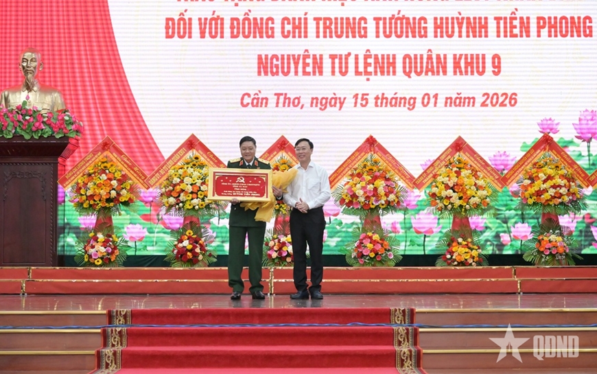 | Lãnh đạo tỉnh Cà Mau chúc mừng Trung tướng Huỳnh Tiền Phong, nguyên Tư lệnh Quân khu 9 tại Lễ đón nhận danh hiệu Anh hùng LLVT nhân dân. |