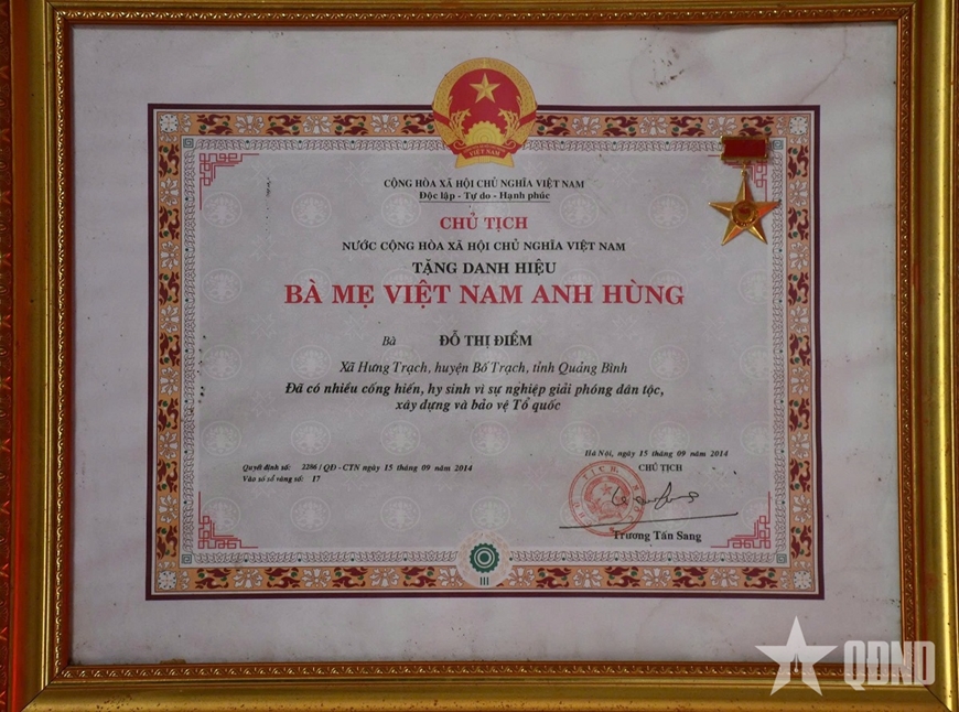 | Mẹ Đỗ Thị Điểm được Chủ tịch nước tặng danh hiệu Bà mẹ Việt Nam anh hùng, năm 2014. |