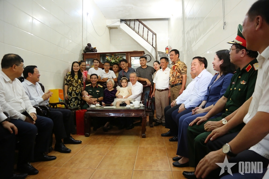 | Tổng Bí thư Tô Lâm và Đại tướng Phan Văn Giang cùng đoàn công tác tới thăm, tặng quà Bà mẹ Việt Nam Anh hùng Nguyễn Thị Kim Oanh. |