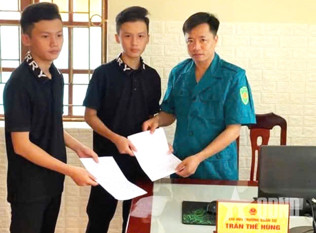 Nguyễn Đức Bình (bên trái) và Nguyễn Đức Thanh nộp đơn tình nguyện nhập ngũ.