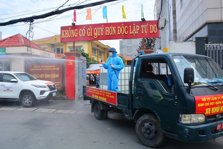 | Phun xịt khử khuẩn trên địa bàn TP Thủ Đức, TP Hồ Chí Minh. Ảnh: Hồng Giang/qdnd.vn |