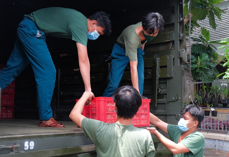 Chiến sĩ Bộ tư lệnh TP Hồ Chí Minh tiếp nhận hàng hóa để hỗ trợ người dân.