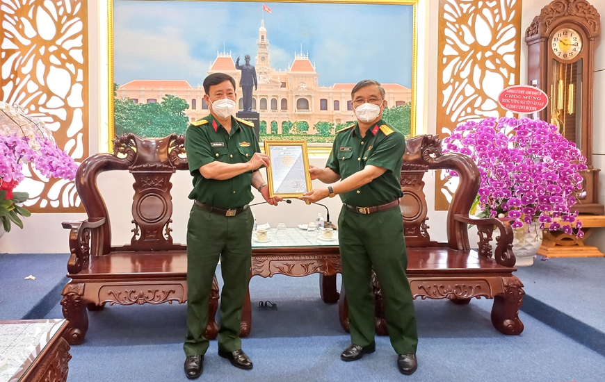 Đại tá Phan Văn Chương, Phó chủ nhiệm Hậu cần Quân khu 9 (bên trái) nhận thư cảm ơn của Bộ tư lệnh TP Hồ Chí Minh.