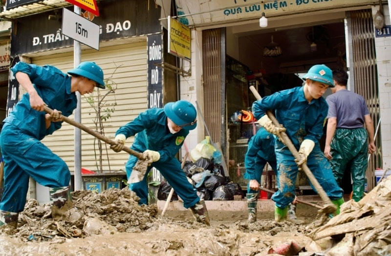 | Dân quân tự vệ huyện Văn Chấn, tỉnh Yên Bái (cũ) hỗ trợ người dân khắc phục hậu quả mưa lũ, tháng 9-2024. Ảnh: qdnd.vn |