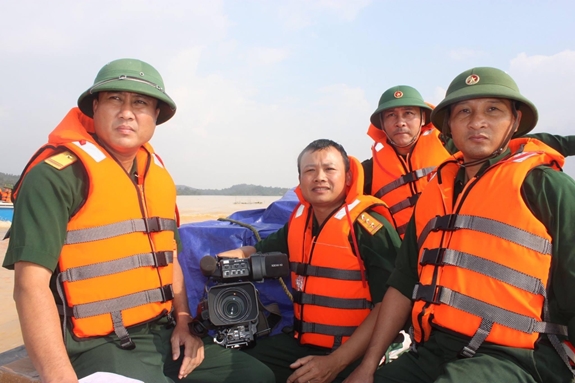 Phóng viên Hồ Quốc Việt (thứ hai, từ trái sang) cùng đồng đội trên đường tác nghiệp. |