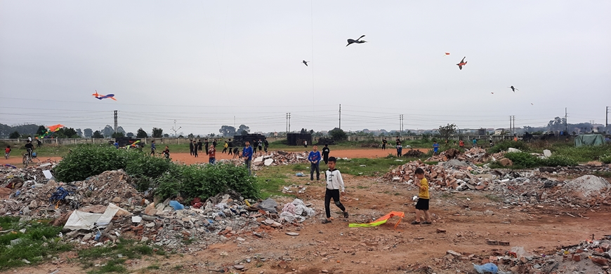 Tuy nhiên, thật ái ngại vì nơi đây nhiều chỗ là những bãi rác thải xây dựng mấp mô, trong đó còn có rất nhiều mảnh chai lọ, kính vỡ. Thế nhưng các cháu vẫn vô tư chơi đùa, chạy nhảy bởi không có chỗ nào khác. Lại gần hỏi chuyện, một cháu nhỏ cho biết: “Thời gian qua, chúng cháu phải nghỉ học vì dịch Covid-19 nên chiều nào cũng ra đây chơi thả diều, kéo co, nhảy dây... vui lắm chú ạ! Trước đây, chúng cháu thường ra đây chơi vào sáng sớm và buổi chiều. Ở đây gần cánh đồng, nhiều gió thả diều rất thích".