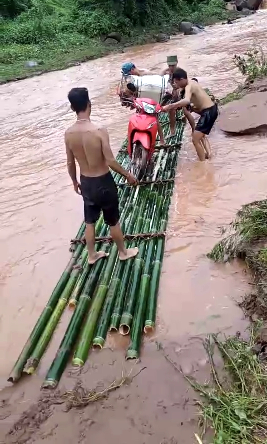 | Một số người dân đóng bè để đi qua khu vực ngầm tràn. |