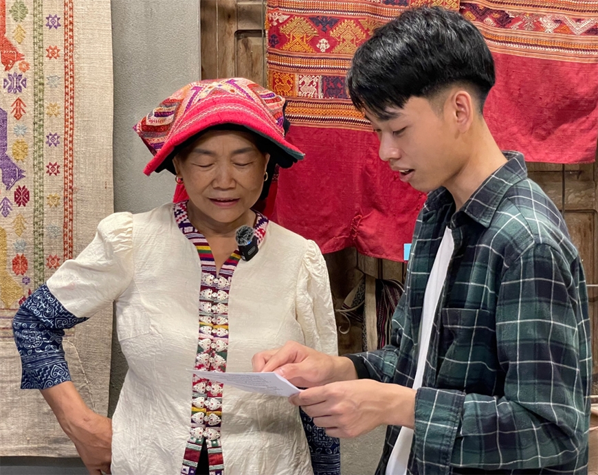 Sầm Công Danh tìm hiểu về ngôn ngữ, chữ viết của người Thái từ những người lớn tuổi. |