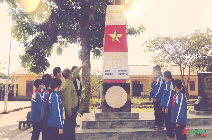 Bên cụm mô hình cột mốc biên giới và bia chủ quyền biển, đảo được đặt trong khuôn viên nhà trường, ông Võ Trọng Hoàn, Chủ tịch Hội Cựu chiến binh (CCB) xã Cẩm Sơn giới thiệu cho các em học sinh về ý nghĩa, tầm quan trọng của bia chủ quyền.