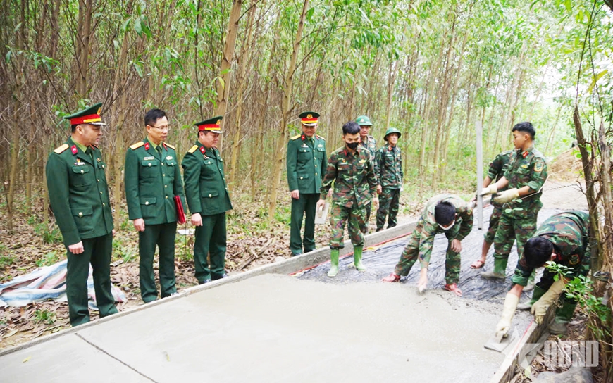 Cán bộ, chiến sĩ Trung đoàn 996 giúp bản Khe Dây đổ bê tông "Đường quân dân kiểu mẫu".