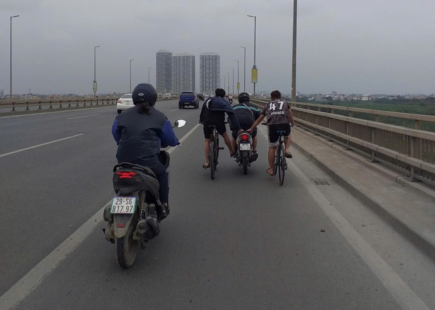 | Học sinh đi xe đạp bám vào xe máy khi lưu thông trên cầu Vĩnh Tuy (Hà Nội). |