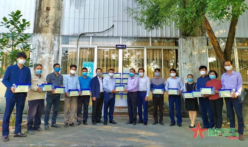 Lãnh đạo Công ty Cổ phần Cơ khí Mạo Khê-Vinacomin trao hộp thuốc dự phòng cho công nhân.