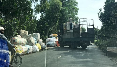 Sau khi phế thải thu gom, xử lý được cơ sở đóng thành từng bao tải rất lớn. Do tích trữ lâu ngày, lượng phế thải thu gom nhiều nên chủ cơ sở đã chất thành từng đống lấn chiếm lòng lề đường. Cùng đó, nhiều xe ba gác tự chế dùng để vận chuyển phế thải để dọc bên đường và hằng ngày nhiều lượt xe ô tô ra vào vận chuyển phế thải (xem ảnh) gây ảnh hưởng không nhỏ đến việc lưu thông của các phương tiện, tiềm ẩn nhiều nguy cơ mất an toàn. Đề nghị chính quyền địa phương sớm có biện pháp tuyên truyền, thậm chí xử phạt để sự việc không tái diễn.