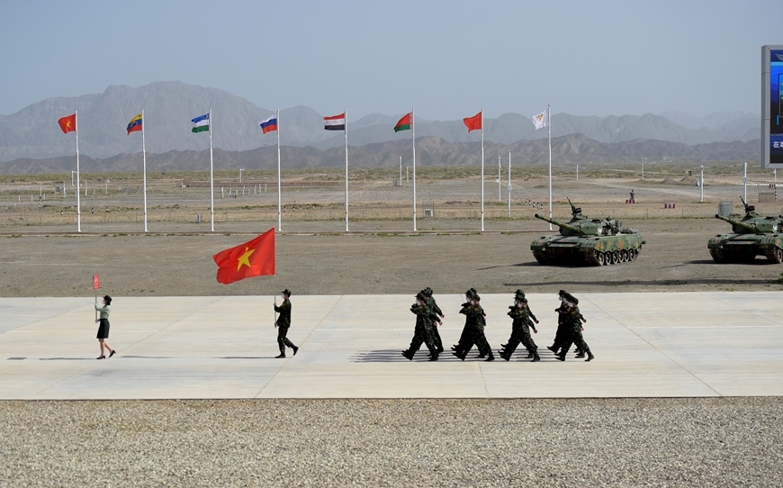 | Khối diễu hành của Đội tuyển Hóa học QĐND Việt Nam tại lễ khai mạc Army Games 2021 ở Căn cứ quân sự Korla, Tân Cương (Trung Quốc). Ảnh: Kiên Cường. |