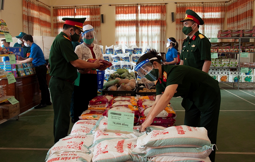 Theo đó, Ban CHQS huyện đã phối hợp với các cơ quan, đơn vị trên địa bàn tổ chức nhiều hoạt động thiết thực, điển hình như phối hợp với Huyện đoàn Mỹ Đức và các nhà tài trợ tổ chức “Siêu thị mini 0 đồng” tại xã An Phú với 600 suất quà (mỗi suất trị giá 400.000 đồng) để tặng người dân; trích quỹ và phát động cán bộ, nhân viên đơn vị ủng hộ, trao 60 suất quà (mỗi suất trị giá 300.000 đồng) tặng hộ nghèo và người dân gặp khó khăn tại 3 xã: Hùng Tiến, An Tiến và Đốc Tín. Món quà tuy nhỏ nhưng đó là sự chia sẻ, nguồn cổ vũ, động viên đối với những người có hoàn cảnh khó khăn. Ngoài ra, Ban CHQS huyện còn phối hợp giúp nhân dân thu hoạch, tiêu thụ 12,7 tấn nhãn, 47.200 quả trứng và hàng chục tấn rau các loại. Chị Quách Thị Quyên, dân tộc Mường ở thôn Pơ Môi (xã An Phú) bày tỏ: “Do ảnh hưởng của dịch Covid-19 nên vợ chồng tôi phải nghỉ việc, không có thu nhập. Sự giúp đỡ của cán bộ, chiến sĩ Ban CHQS huyện Mỹ Đức làm chúng tôi ấm lòng, thêm động lực để vượt qua khó khăn”.