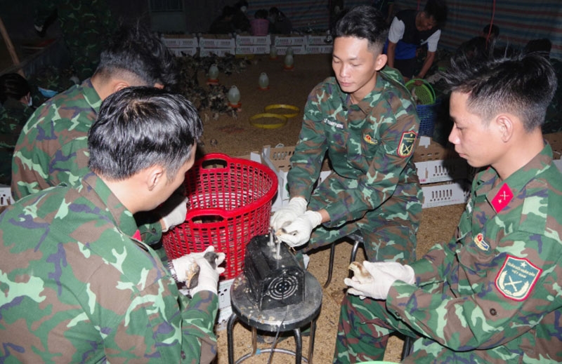 Hơn 10.000 con gà giống Bến Tre được Đoàn Kinh tế-Quốc phòng 959, Quân khu 9 chăm sóc kỹ lưỡng để bàn giao cho các hộ dân Khu Kinh tế-Quốc phòng Tân Hồng, tỉnh Đồng Tháp.