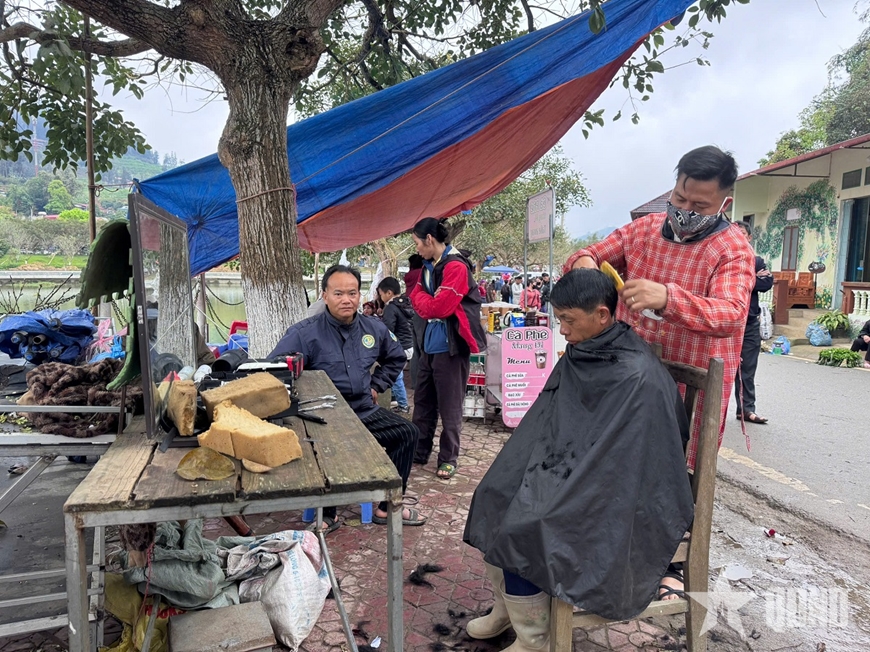 | Tranh thủ cắt tóc khi xuống chợ. |