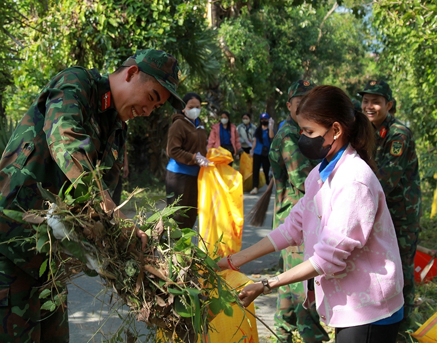 | Phối hợp với đoàn viên, thanh niên phường Chi Lăng, tỉnh An Giang dọn vệ sinh các tuyến đường trong xóm, ấp. |