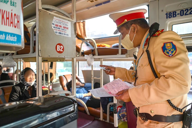 | Cảnh sát kiểm tra một chiếc xe khách giường nằm. Ảnh: Hồng Quang |