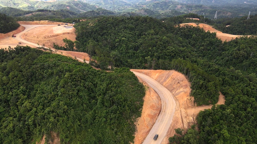 | Một tuyến đường xẻ ngang rừng để vận chuyển thiết bị, phục vụ thi công. |