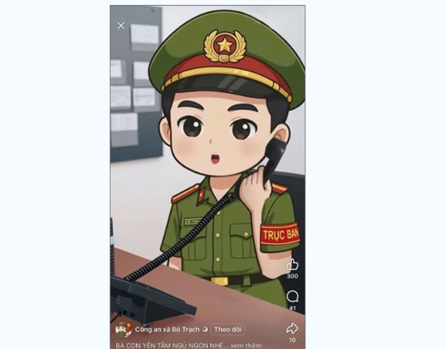 Nắm bắt xu thế đó, Công an xã Bố Trạch, tỉnh Quảng Trị đã triển khai mô hình “Chú công an AI” như một cách làm sáng tạo, gần gũi, góp phần đưa pháp luật đến với người dân theo phương thức mới, sinh động và dễ hiểu hơn. Thay vì các buổi tuyên truyền theo hình thức truyền thống, “Chú công an AI” được xây dựng dưới dạng các video clip ngắn, hình ảnh trực quan, giọng đọc thân thiện và kịch bản gắn với những tình huống quen thuộc trong đời sống hằng ngày. Thông qua các nền tảng mạng xã hội, những quy định pháp luật về an ninh trật tự, an toàn giao thông, phòng, chống tội phạm, lừa đảo trên không gian mạng... được truyền tải nhẹ nhàng, dễ nhớ, dễ tiếp cận, đặc biệt phù hợp với giới trẻ và người dân thường xuyên sử dụng internet.