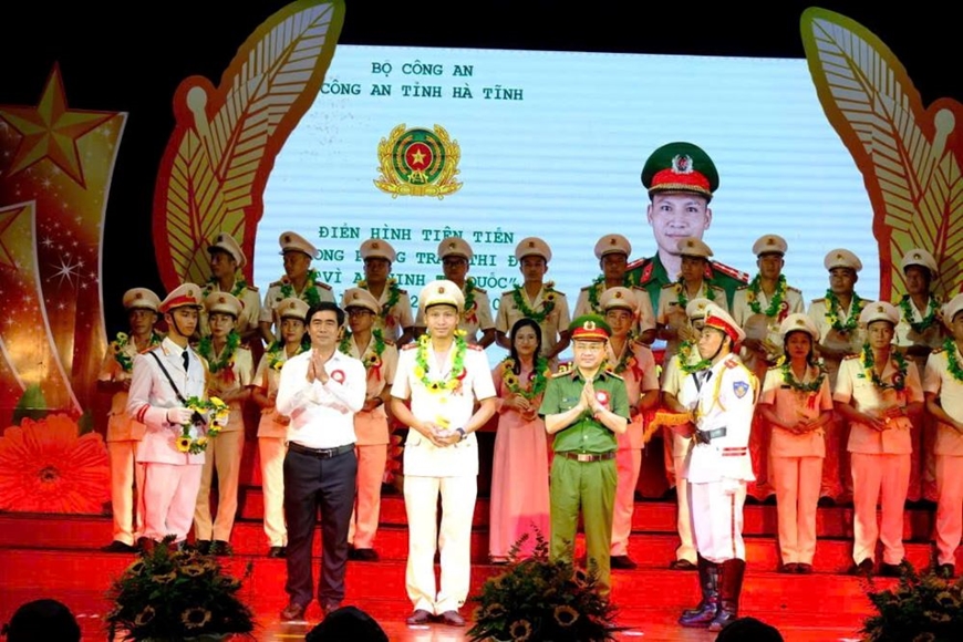 Đại úy Nguyễn Hương Trung (đứng giữa, hàng đầu) được vinh danh là một trong 10 gương mặt tiêu biểu của lực lượng công an Hà Tĩnh năm 2024.