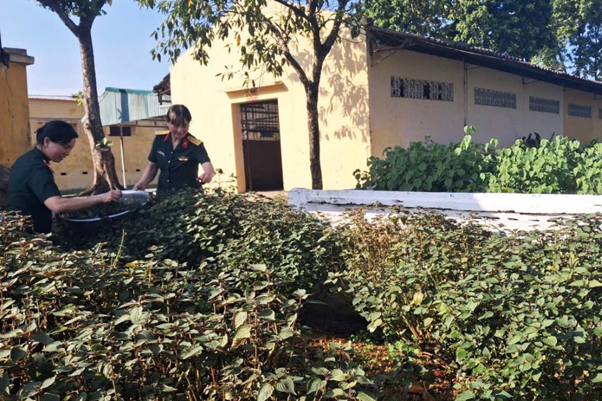 Hội viên Hội Phụ nữ cơ sở Tiểu đoàn 2, Trường Sĩ quan Lục quân 1 hái rau tía tô được chăm sóc bằng nước gạo ngâm vỏ trứng.