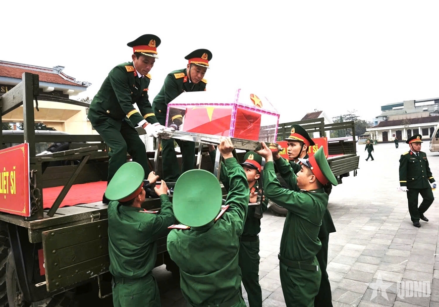 | Các hài cốt liệt sĩ được cán bộ, chiến sĩ trang trọng di chuyển, chuẩn bị đưa về an táng tại Nghĩa trang Liệt sĩ Vị Xuyên. |