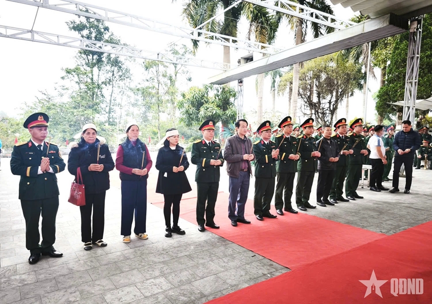 | Đại biểu, cán bộ, chiến sĩ và thân nhân liệt sĩ dâng hương, tưởng niệm các Anh hùng liệt sĩ tại Nghĩa trang Liệt sĩ Vị Xuyên. |
