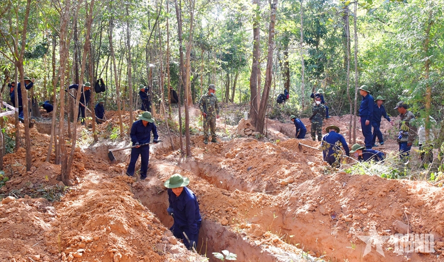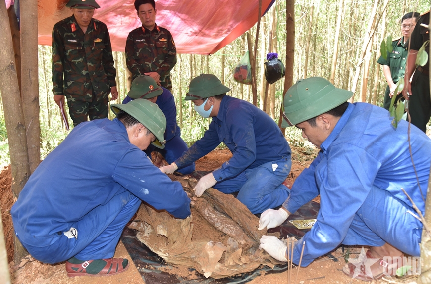 | Đội quy tập Sư đoàn 968 quy tập hài cốt liệt sĩ tại xã Cam Lộ, tỉnh Quảng Trị. Ảnh: HUY CƯỜNG |