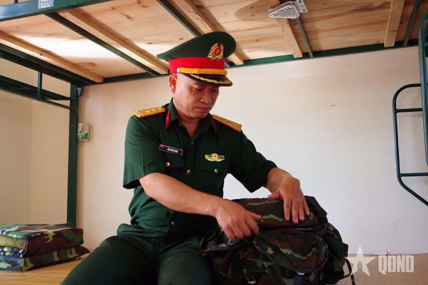 Trung tá Bùi Đình Quận, nhân viên Đội quy tập đang chuẩn bị các vật dụng thiết yếu sẵn sàng lên đường làm nhiệm vụ.