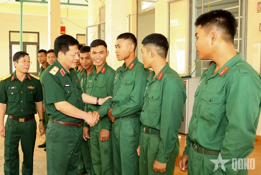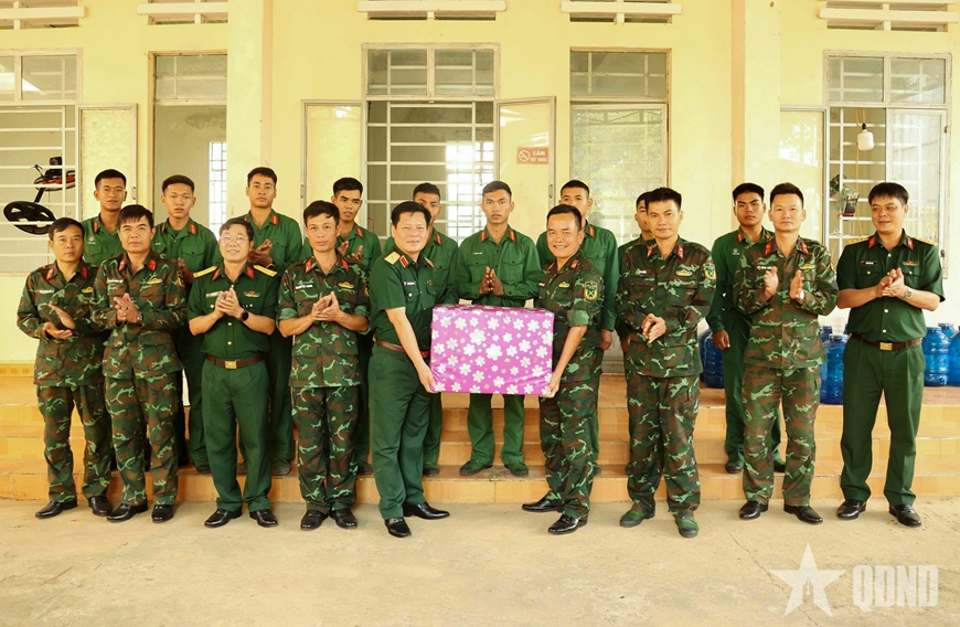 | Thiếu tướng Nguyễn Trần Long động viên và trao quà tặng cán bộ, chiến sĩ Đội quy tập mộ liệt sĩ Quân đoàn đang thực hiện nhiệm vụ tại xã Ia Ly, tỉnh Gia Lai. |