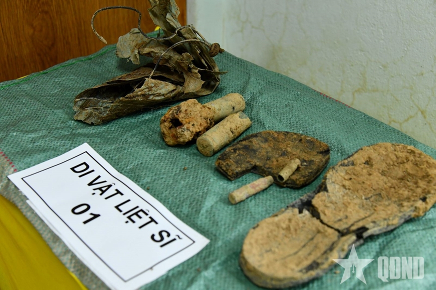 Hài cốt liệt sĩ được phát hiện ở độ sâu khoảng 1m, các xương đã vỡ vụn thành nhiều mảnh nhỏ. Di vật kèm theo gồm: 1 đuôi đạn cối 81mm; 1 vỏ đạn 12,7mm; dép cao su cùng tăng, võng bộ đội.