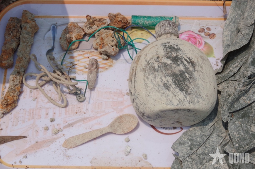 Di vật kèm theo gồm: 1 tăng lót hầm, 1 bình tông, 2 bát ăn cơm B52, dây dù, dây thông tin, 1 súng tiểu liên AK đã bị ôxy hóa…