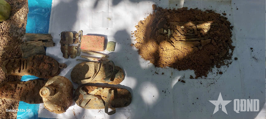 Hài cốt tìm thấy gồm: Xương sọ, răng, xương ống tay, ống chân và một số mảnh xương vụn, cùng với các di vật như tăng ni lông, bình đông, đầu móc khóa thắt lưng to bộ đội, đầu thắt lưng bộ đội, lọ Penixilin, dép cao su, 2 bút máy, bút bi hiệu “BIC”; hài cốt chưa xác định được danh tính; được lấy mẫu sinh phẩm để xác định danh tính.