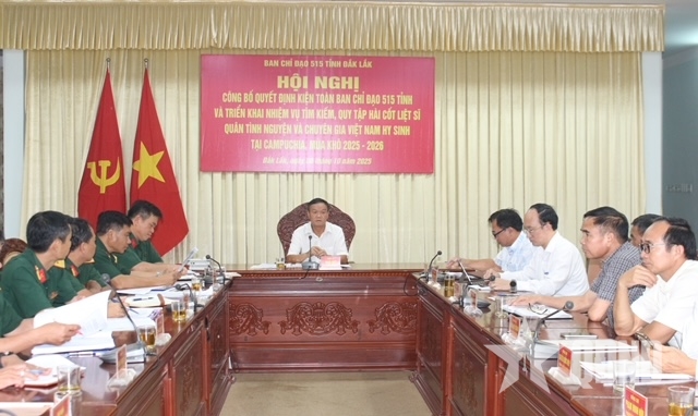 Hội nghị đã công bố Quyết định số 01354/QĐ-UBND, ngày 18-9-2025 của UBND tỉnh Đắk Lắk về việc kiện toàn Ban Chỉ đạo 515 và Tổ giúp việc Ban Chỉ đạo 515 tỉnh Đắk Lắk về tìm kiếm, quy tập và xác định danh tính tỉnh Đắk Lắk; thông qua dự thảo quy chế hoạt động của Ban Chỉ đạo 515 tỉnh; thông qua Dự thảo báo cáo kết quả công tác tìm kiếm, quy tập hài cốt liệt sĩ Quân tình nguyện và Chuyên gia Việt Nam hy sinh qua các thời kỳ chiến tranh tại Vương quốc Campuchia, mùa khô 2024-2025 và danh sách đề nghị UBND tỉnh tặng Bằng khen.