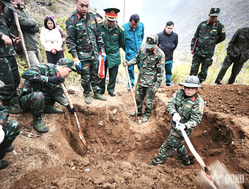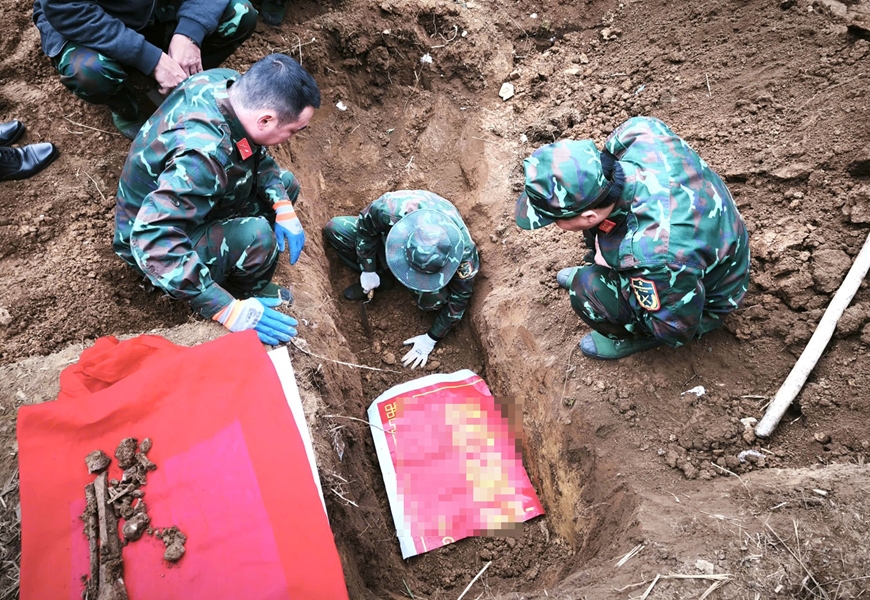 Tiến hành cất bốc, thu gom hài cốt liệt sĩ tại hiện trường, bảo đảm đúng quy trình và trang nghiêm.