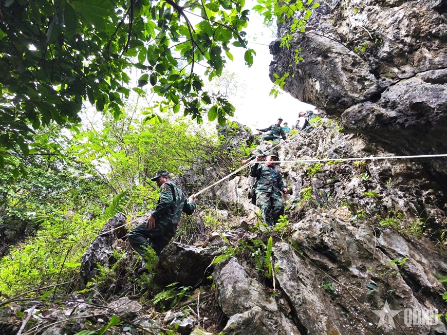 | Bộ đội vượt núi, băng rừng đưa hài cốt liệt sĩ xuống núi trong điều kiện địa hình hiểm trở. |