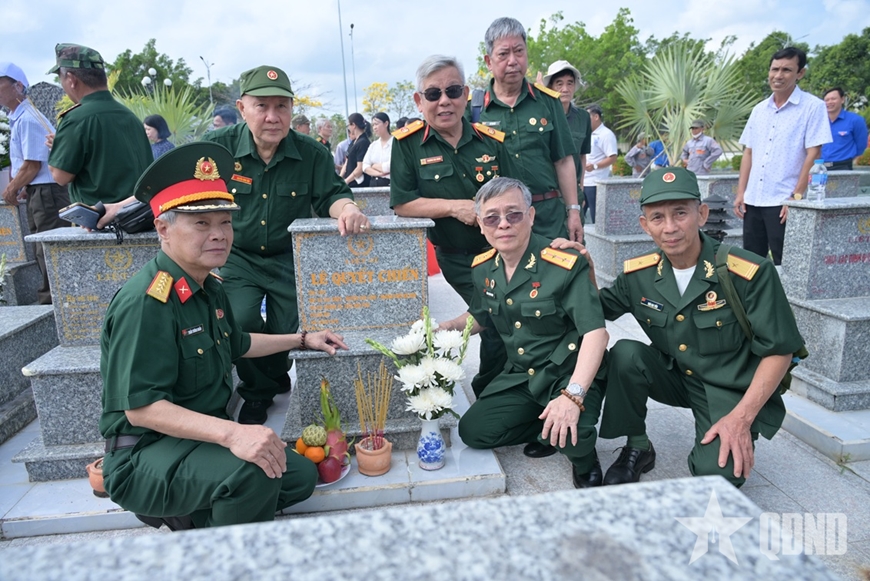 | Ban liên lạc Cựu chiến binh Trung đoàn 1, Quân khu 9 (khu vực Hà Nội) bên ngôi mộ đồng đội vừa được xác định danh tính. |